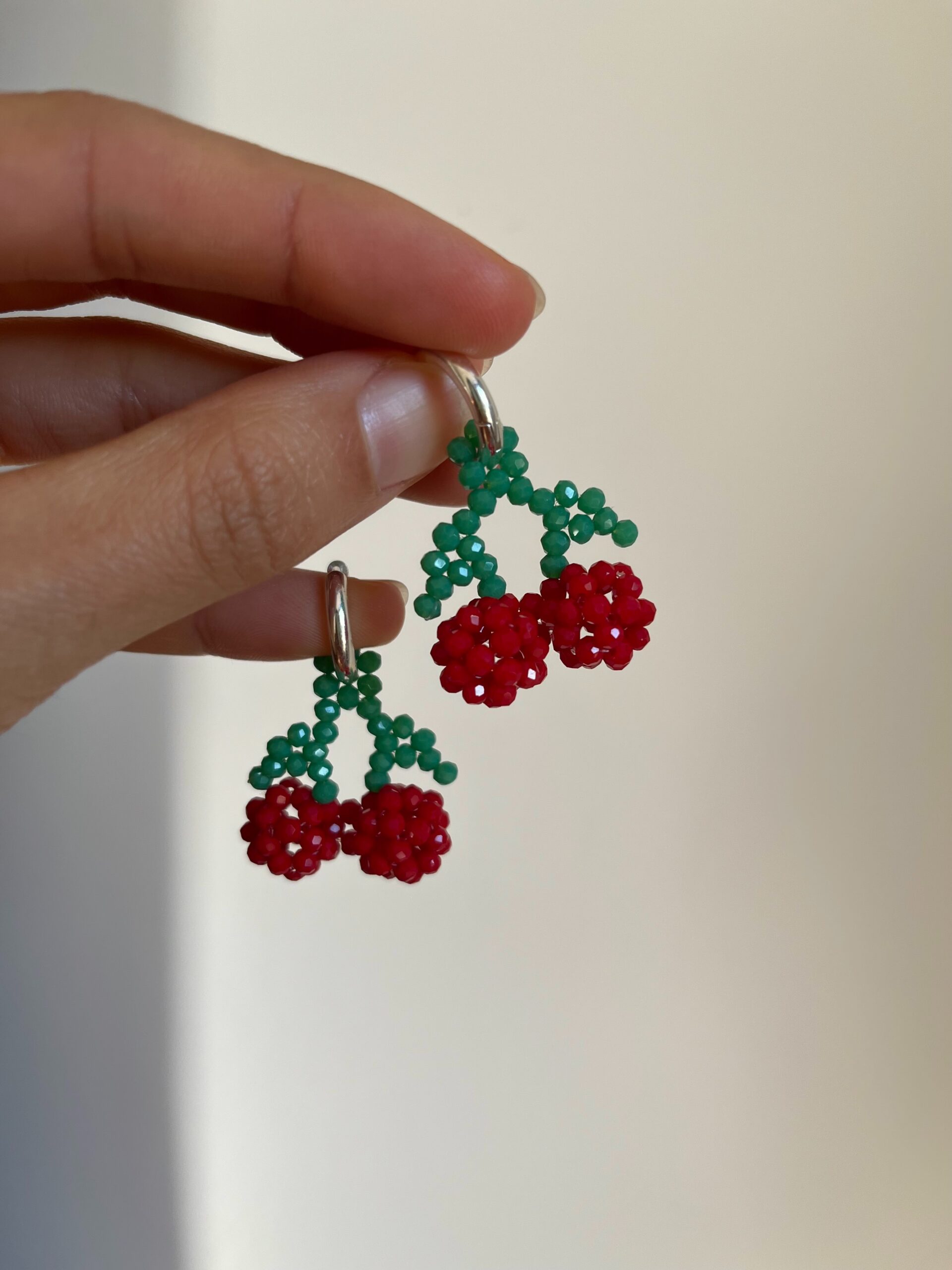 Dijes cerezas de cristales hecho a mano. 2,5 cm de largo.