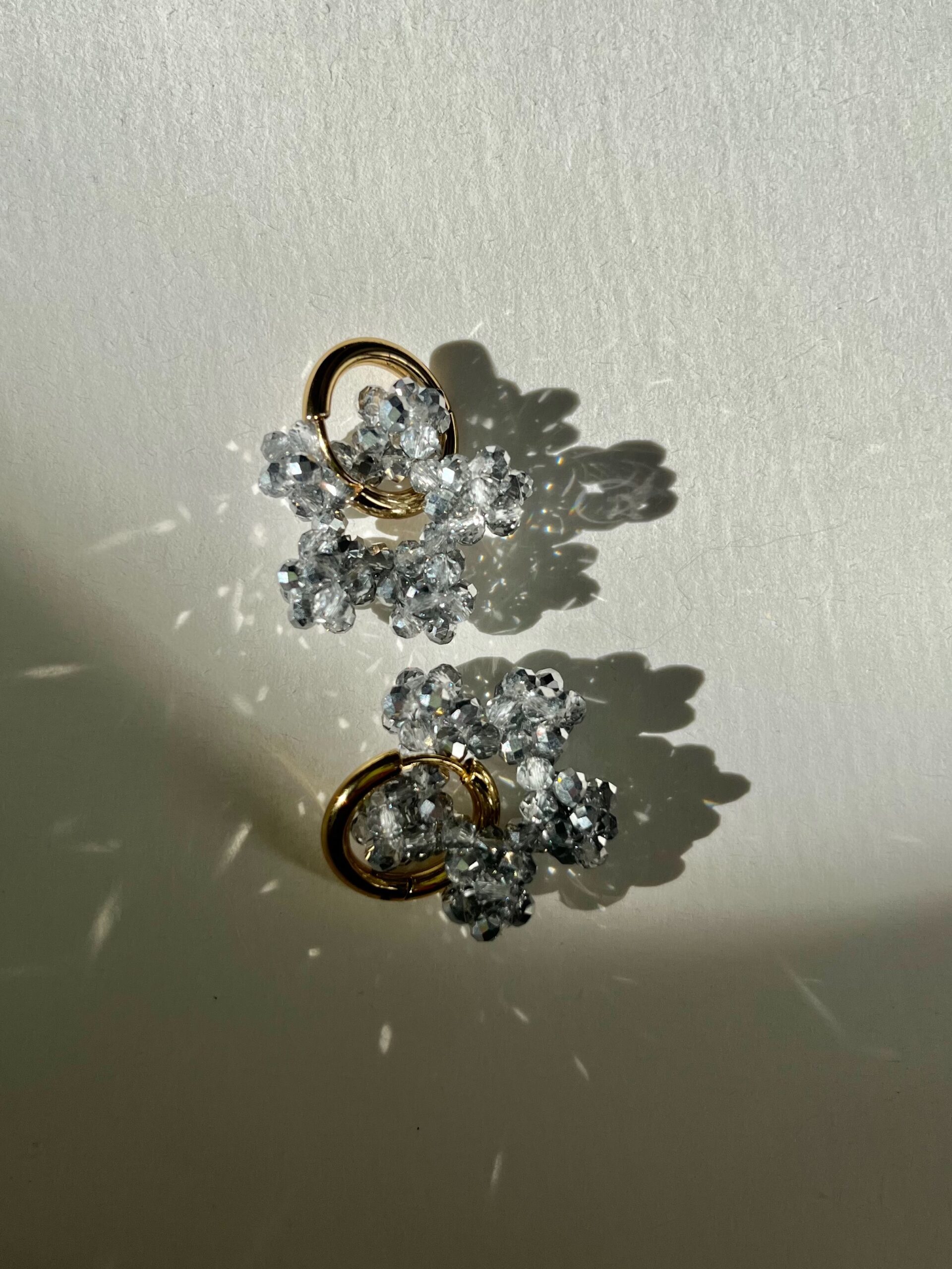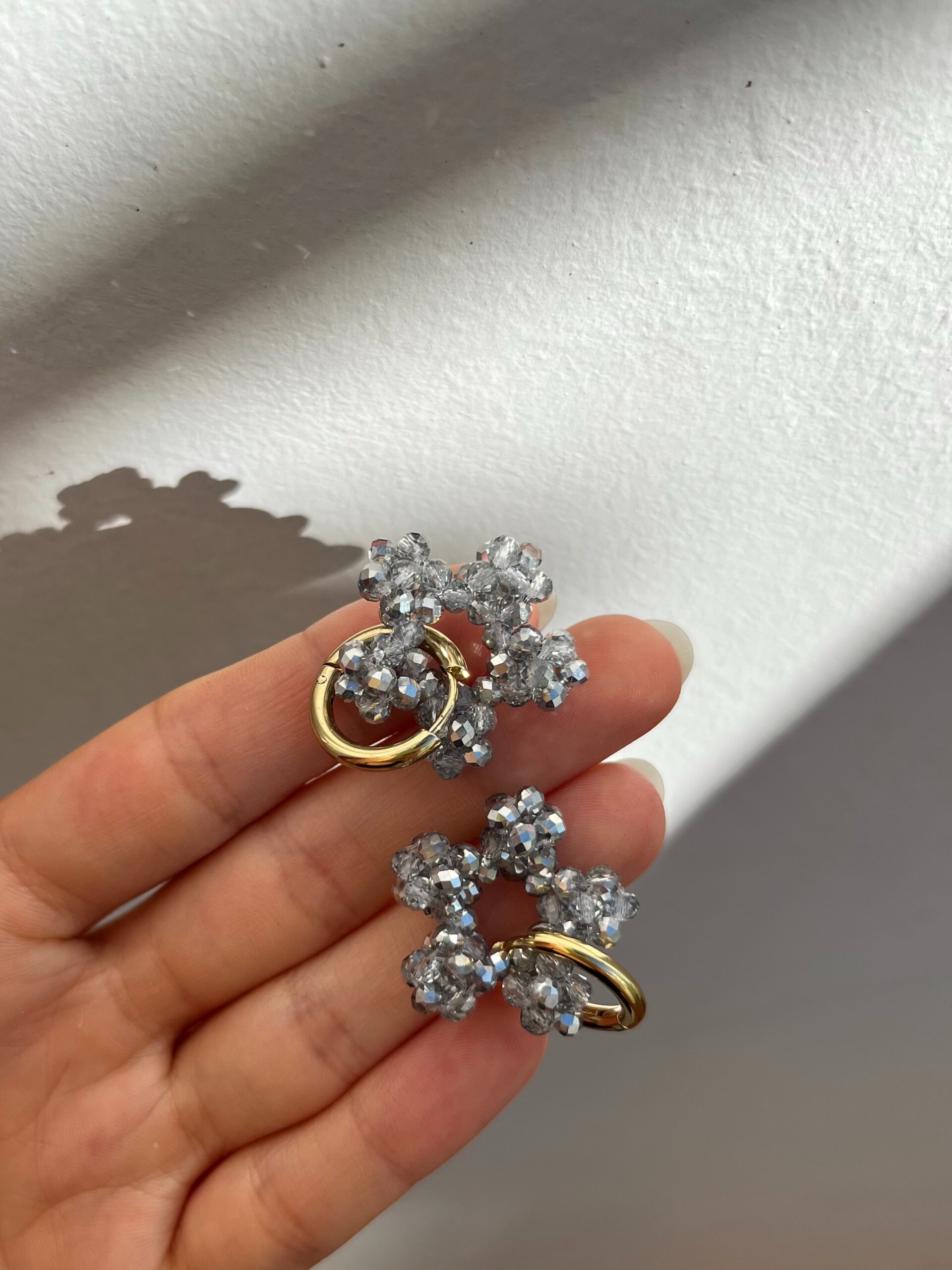 Dijes flor de cristales hechos a mano. 2 cm de largo. Argollas de acero dorado 1,5 cm de diámetro.