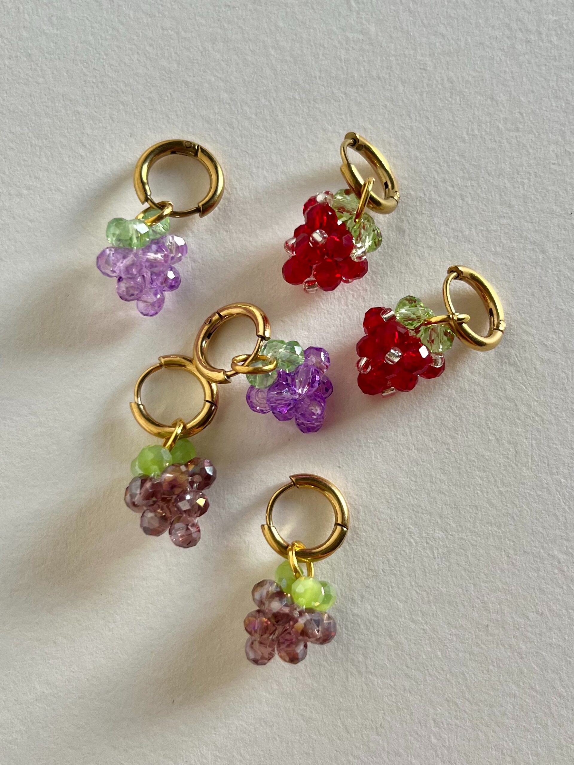 Dijes hechos a mano con cristales. 1,3 cm de largo. Argollas de acero dorado 1 cm de diámetro.