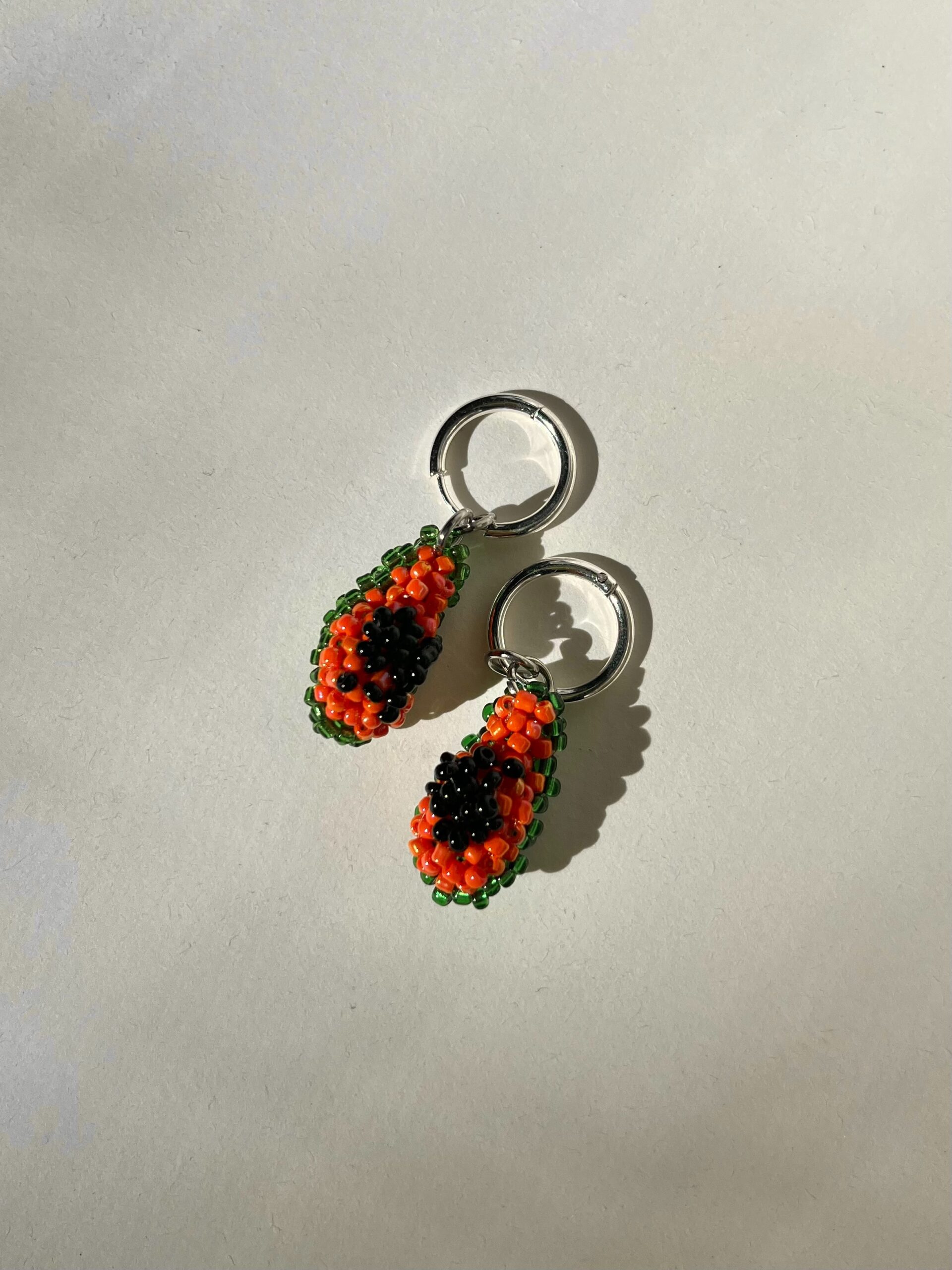 Dijes de papayas de mostacillas hechos a mano 🙂 Argollas de acero blanco 1,4 cm de diámetro // Argollas de acero dorado 1,4 cm de diámetro.