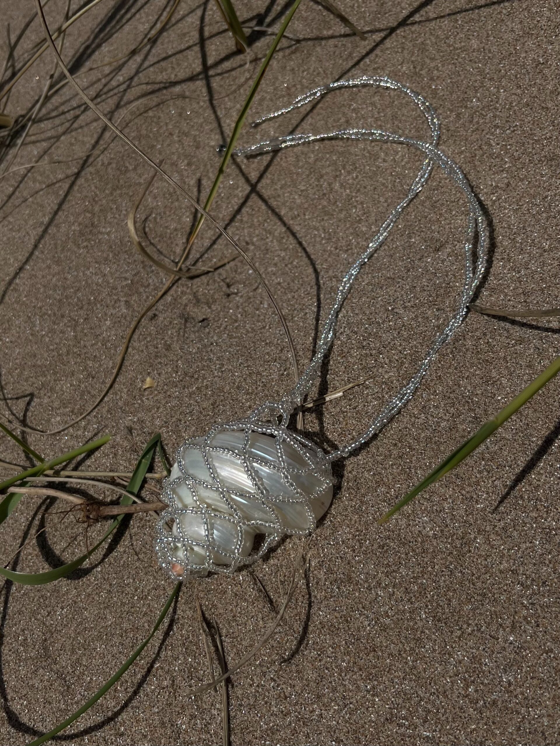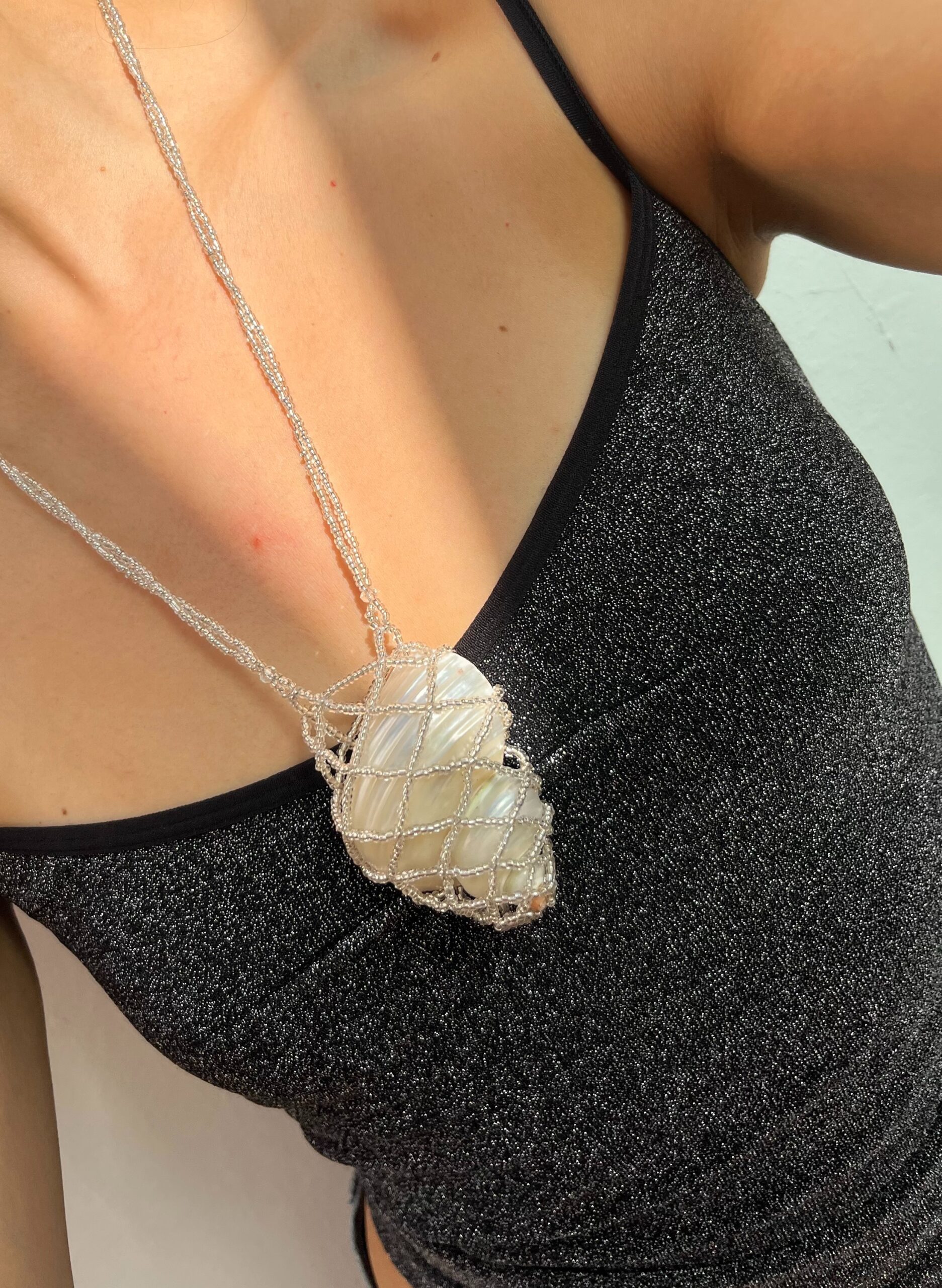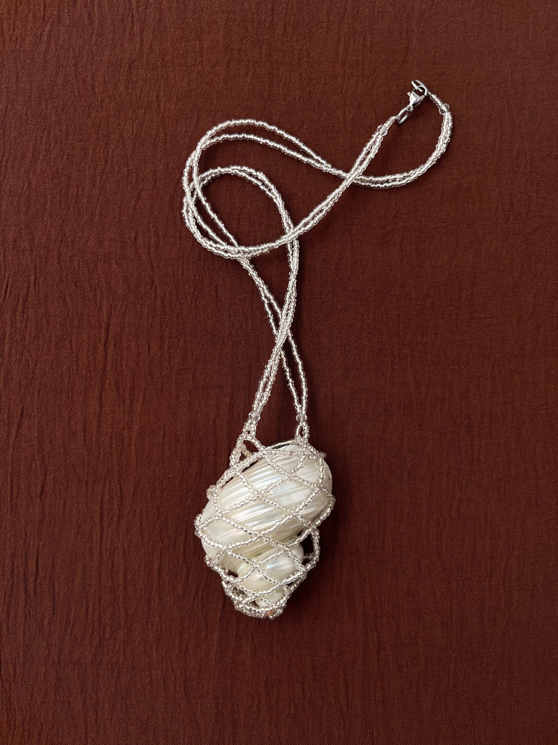Collar con caracol natural nacarado (7 cm aproximadamente) y red de mostacillas hecha a mano 🙂 52 cm de largo. Gancho de acero quirúrgico.