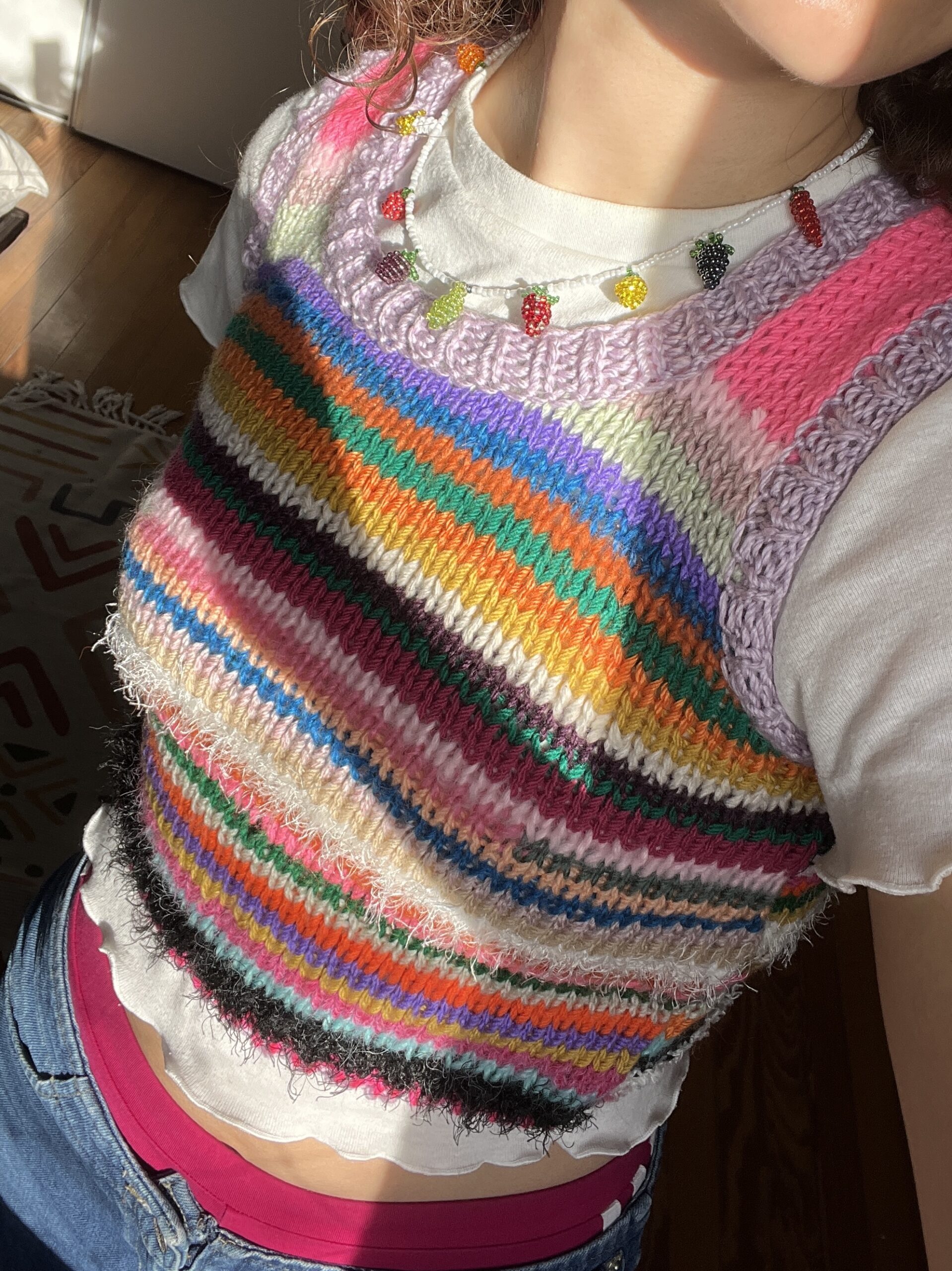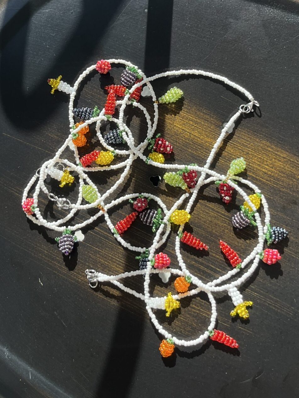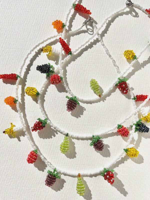 Collar de mostacillas. Diez dijes de frutas de mostacillas surtidos hechos a mano. 42 cm de largo. Gancho de acero quirúrgico.