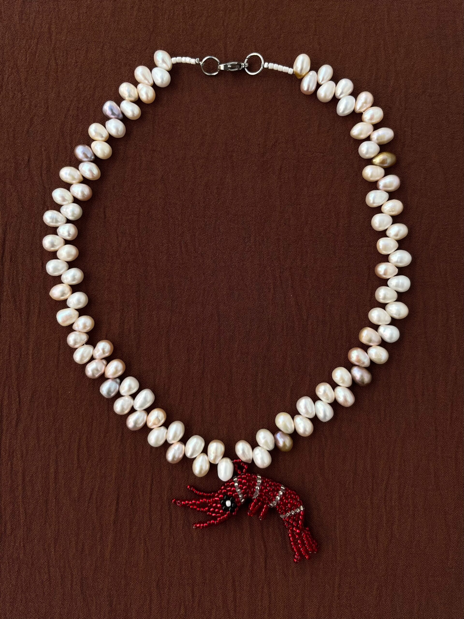 Collar de perlas de río naturales y dije de langostino (5 cm) de mostacillas hecho a mano 🙂 44 cm de largo. Gancho de acero quirúrgico.