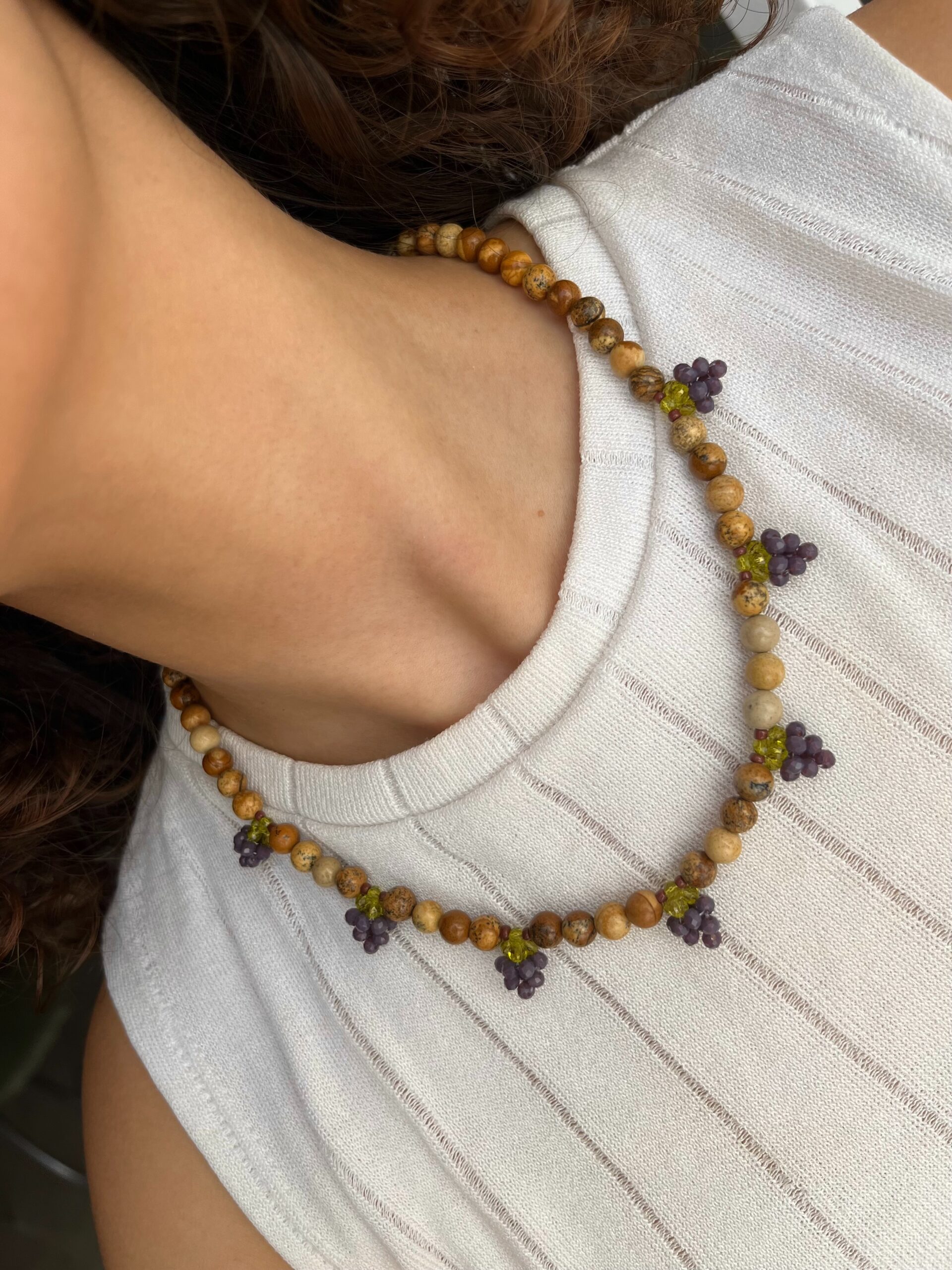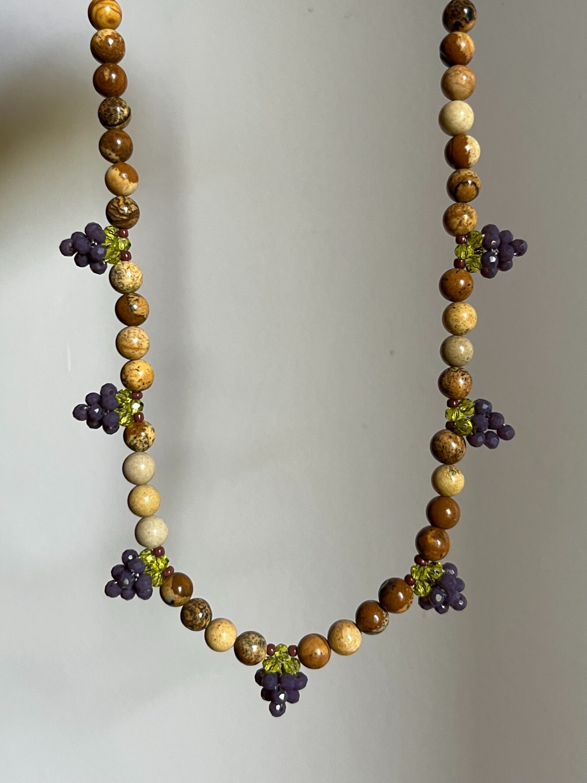 Collar de piedras naturales (jaspe) y siete dijes de uvas de cristales hechos a mano 🙂 43 cm de largo. Gancho de acero quirúrgico.