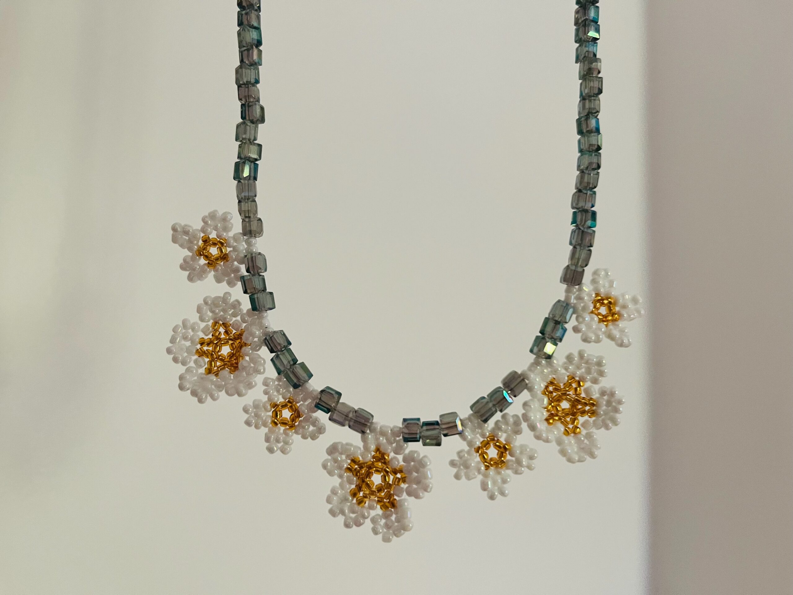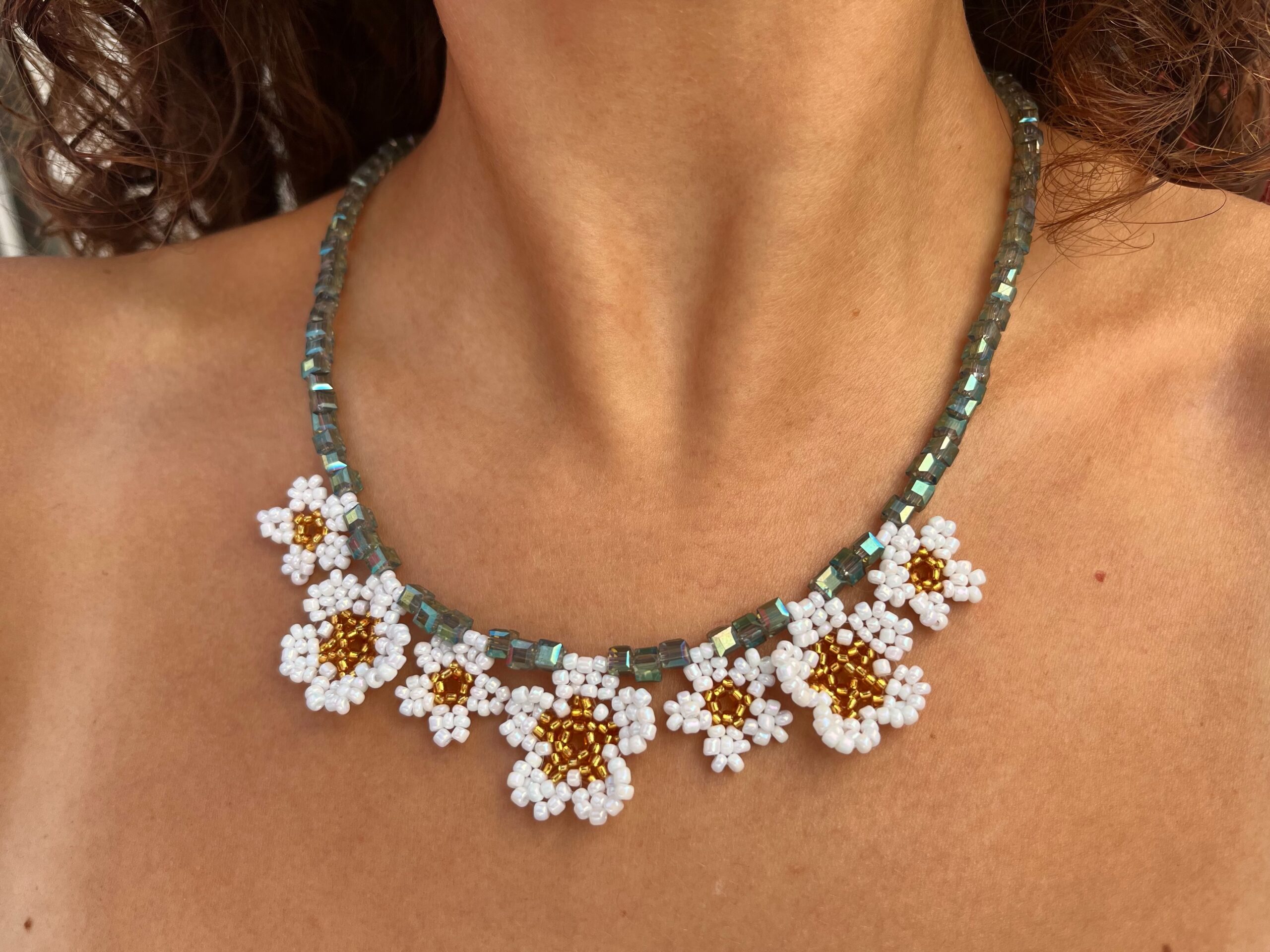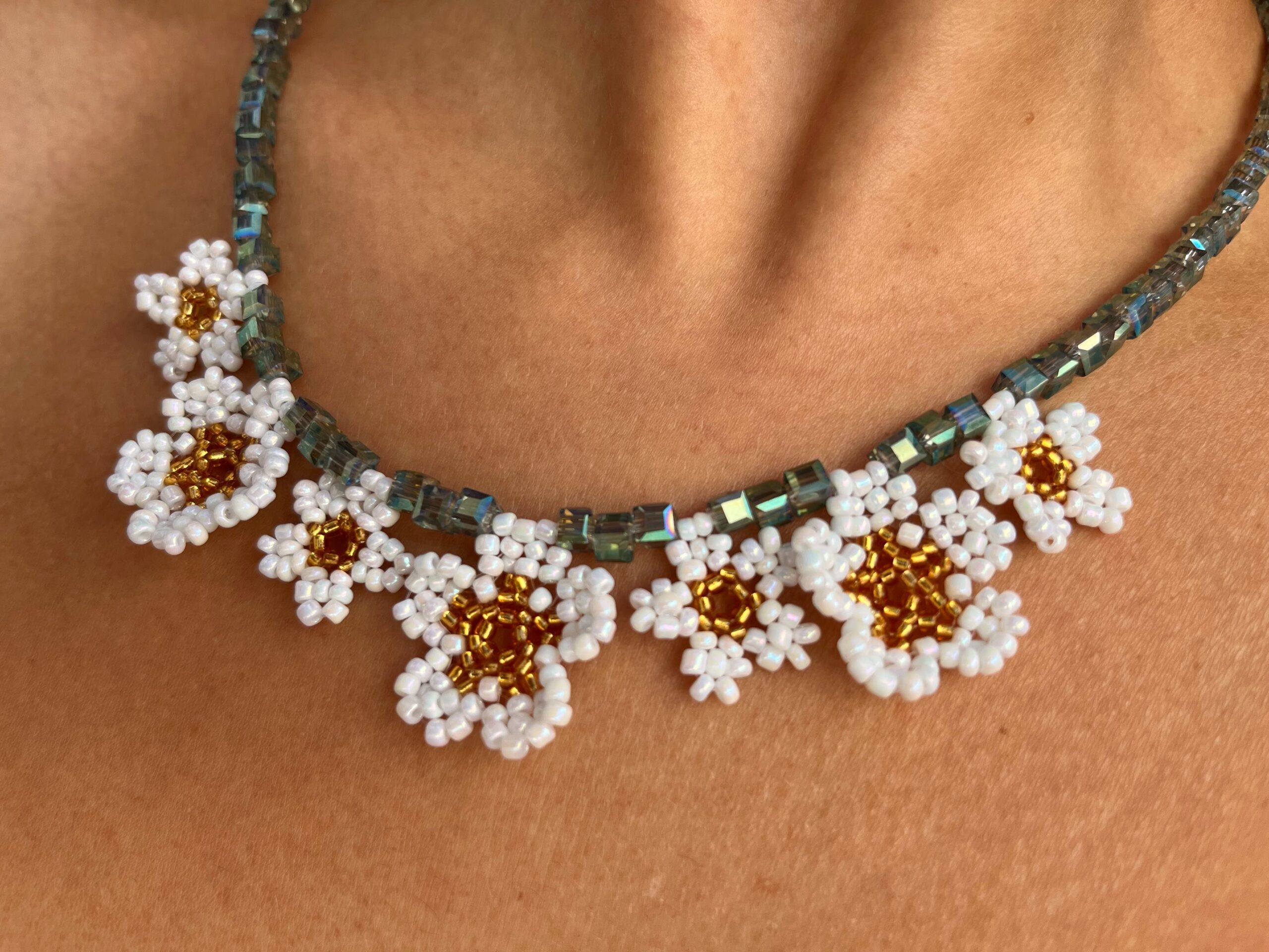 Collar de cristales cúbicos tornasolados con 7 dijes de de flores de mostacillas hechos a mano 43 cm de largo. Gancho de acero quirúrgico.