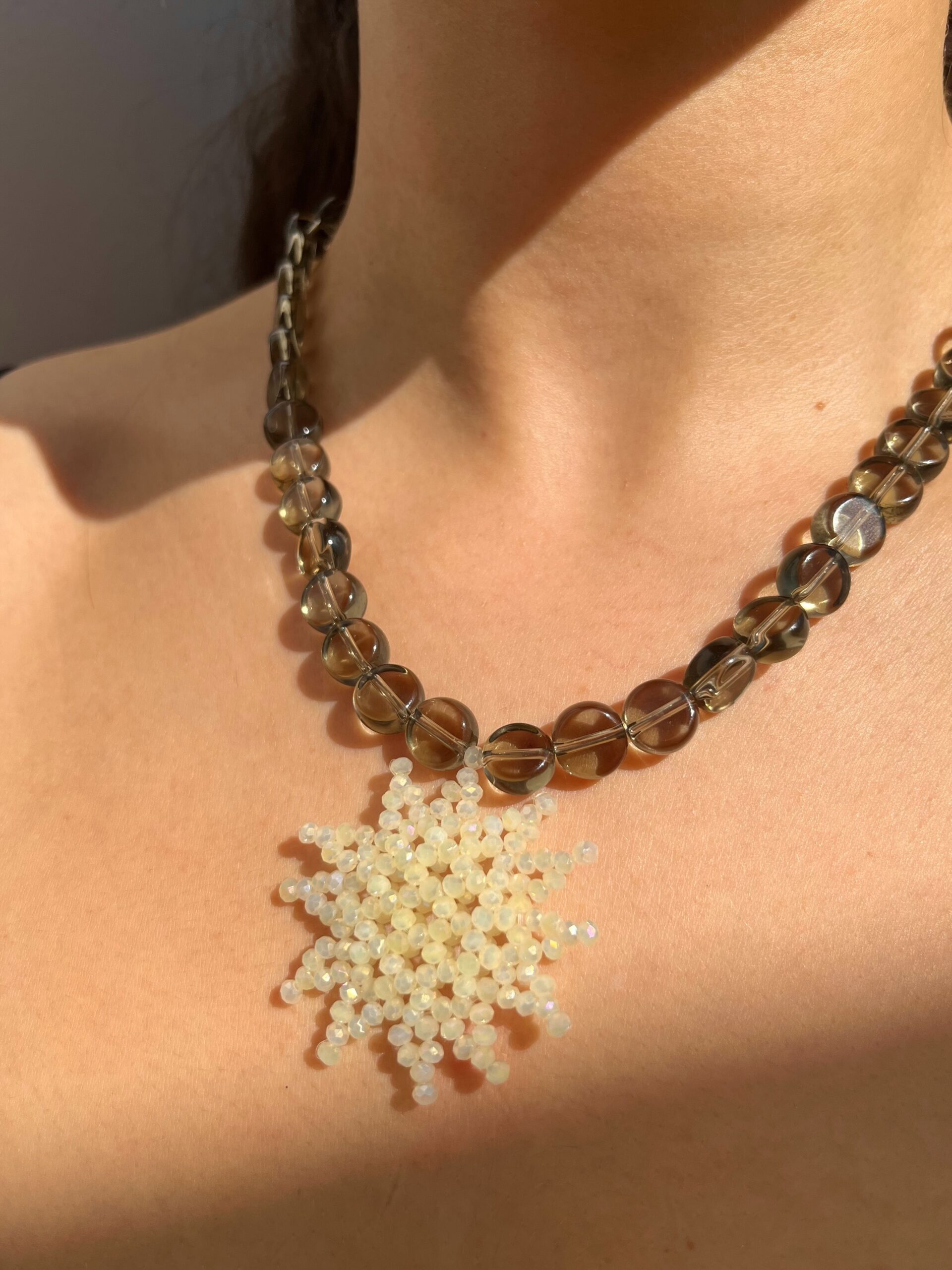Collar de cuentas de vidrio y dije de de sol (4,5 cm) de cristales hechos a mano 🙂 41 cm de largo. Gancho de acero quirúrgico.